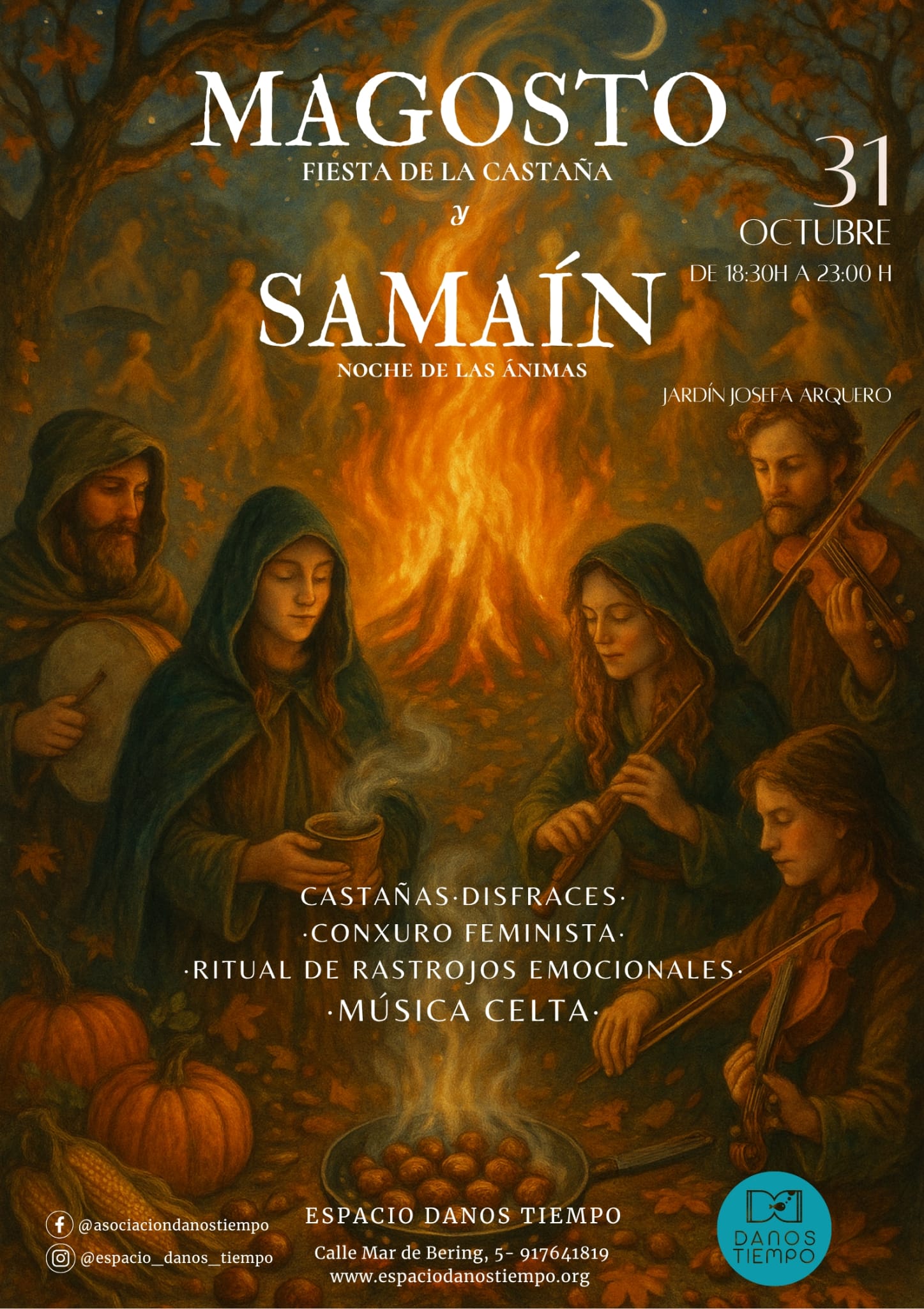 Queremos darle la bienvenida al otoño con esta fiesta para grandes y para peques, que tendrá al grupo de música celta Talisker Band en directo, castañas, disfraces, leyenda contada, ritual de rastrojos emocionales, pintacaras, y el conxuro feminista que mantendrá alejados a los malos espíritus y a las meigas, y nos hará reencontrarnos con las almas que deambulan por el barrio en esta noche de Samaín o Halloween.